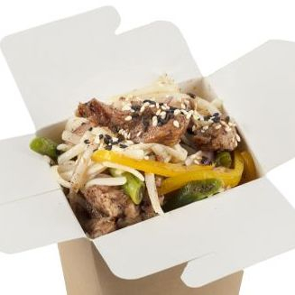 Заказать Лапша пшеничная, свинина, болг. перец, лук, спаржа, шампиньоны, соус сладкий чили, кунжут.