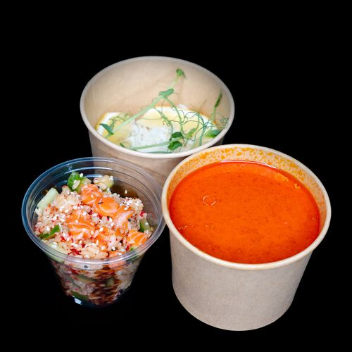 Том Ям (мидии, перец болгарский, шампиньоны, рис, кунжут, лайм), стаканчик Филадельфия (рис, лосось, сыр творожный, огурец, икра масаго, соус Унаги, икра лососевая имитация).