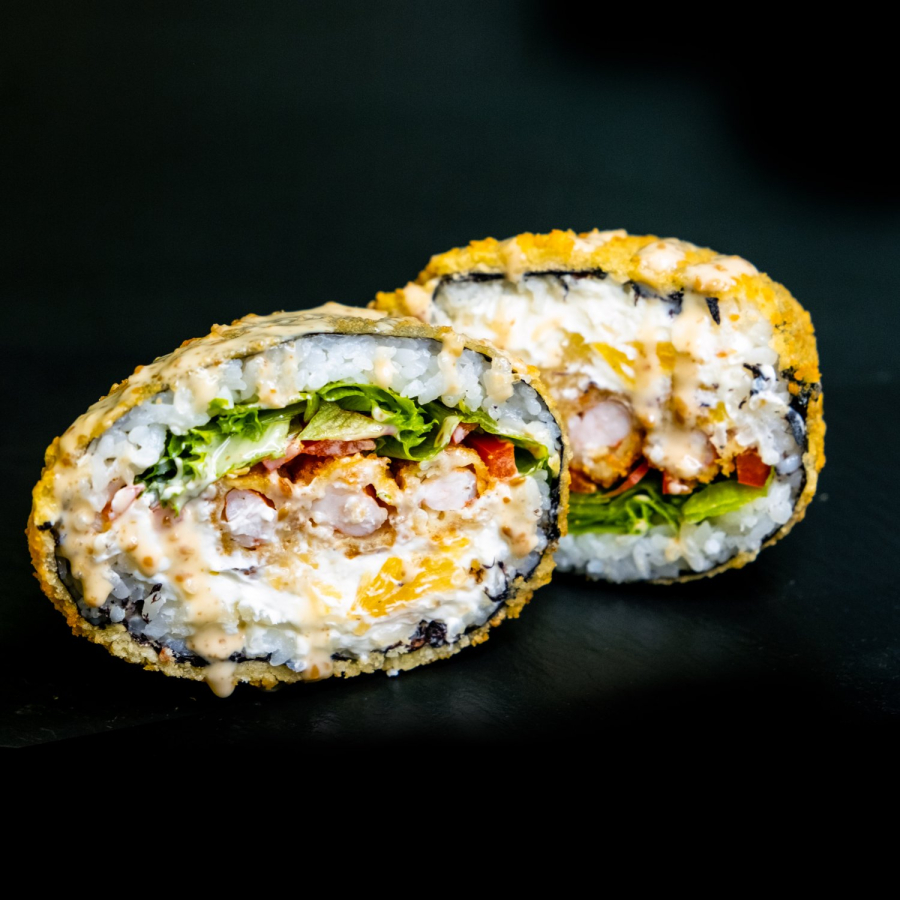 Заказать Нори, рис, сыр творожный, сочная курочка, томаты, сыр Чеддер, лист салата, темпура.
