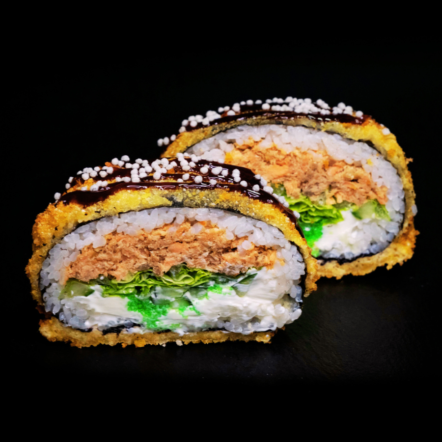 Нори, рис, сыр творожный, темпурная тигровая креветка, авокадо, болгарский перец, соус Унаги, темпура.