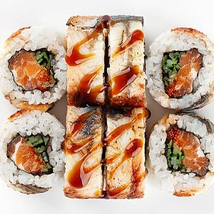 Рис, угорь, лосось, огурец, икра, соус терияки, соус рофано, нори.