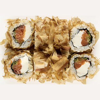 Рис, лосось подкопченный, сыр, огурец, стружка тунца, нори.
