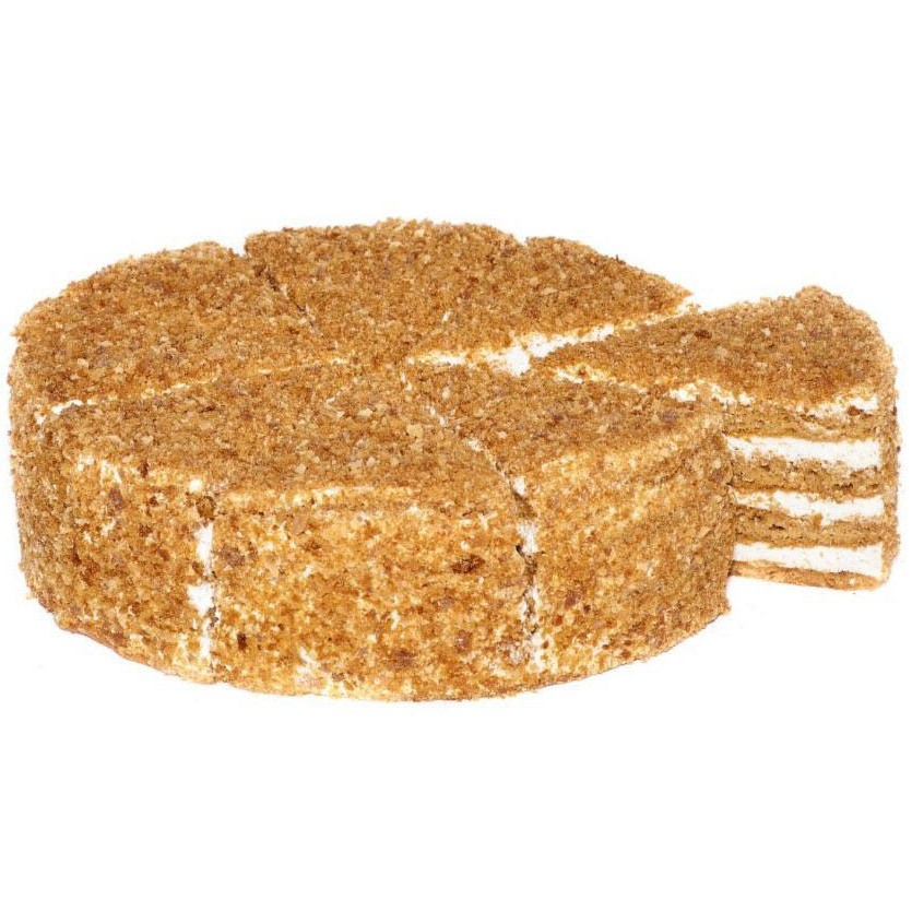 Заказать Состоит из четырех слоев медового бисквита, прослоенных сметанным кремом, верхняя поверхность покрыта сметанным кремом и посыпана крошкой медового бисквита.