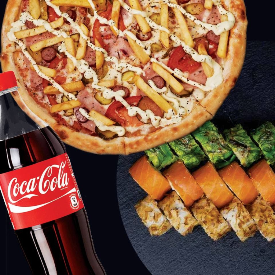 Пицца 4 сезона большая, пицца Пепперони большая, пицца Домашняя фри большая, Кока-Кола 1л.