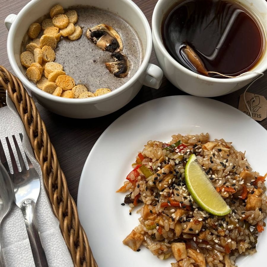 Заказать Крем суп с шампиньонами 250г, рис с курицей терияки 194г, чай 250мл (на доставку чай не заваривается). Укажите количество сахара в комментарии.