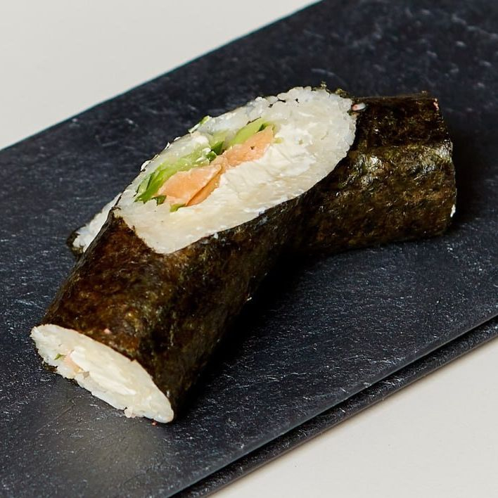 Нори, рис, кунжутное масло, сыр, лосось, огурец.