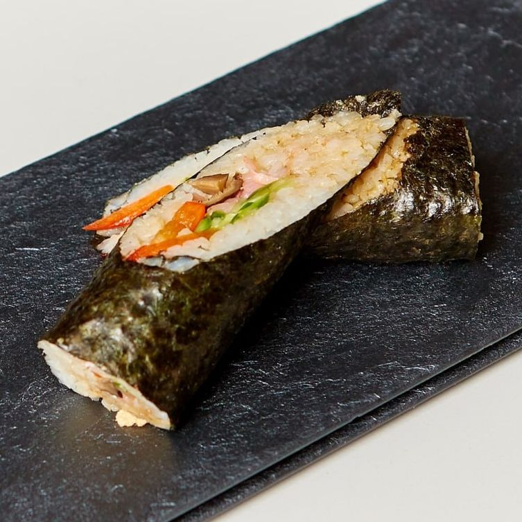 Нори, рис, кунжутное масло, грибы шиитаке, креветка, соус терияки, огурец, болгарский перец.