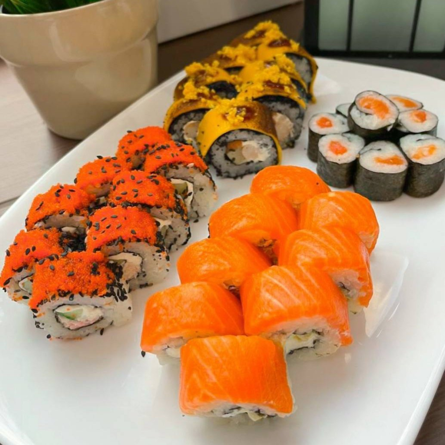 Ролл Филадельфия Лайт, ролл с лососем и чукой, ролл Темпура креветка терияки, Запеченный ролл с мидиями и лососем.