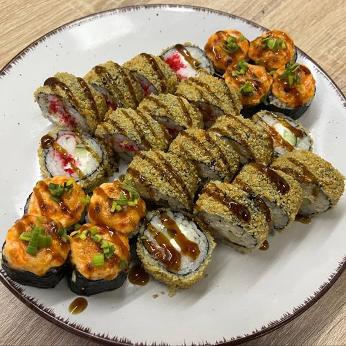Заказать Запечённый ролл с мидиями, Темпура с лососем и сыром, Темпура креветка масаго.