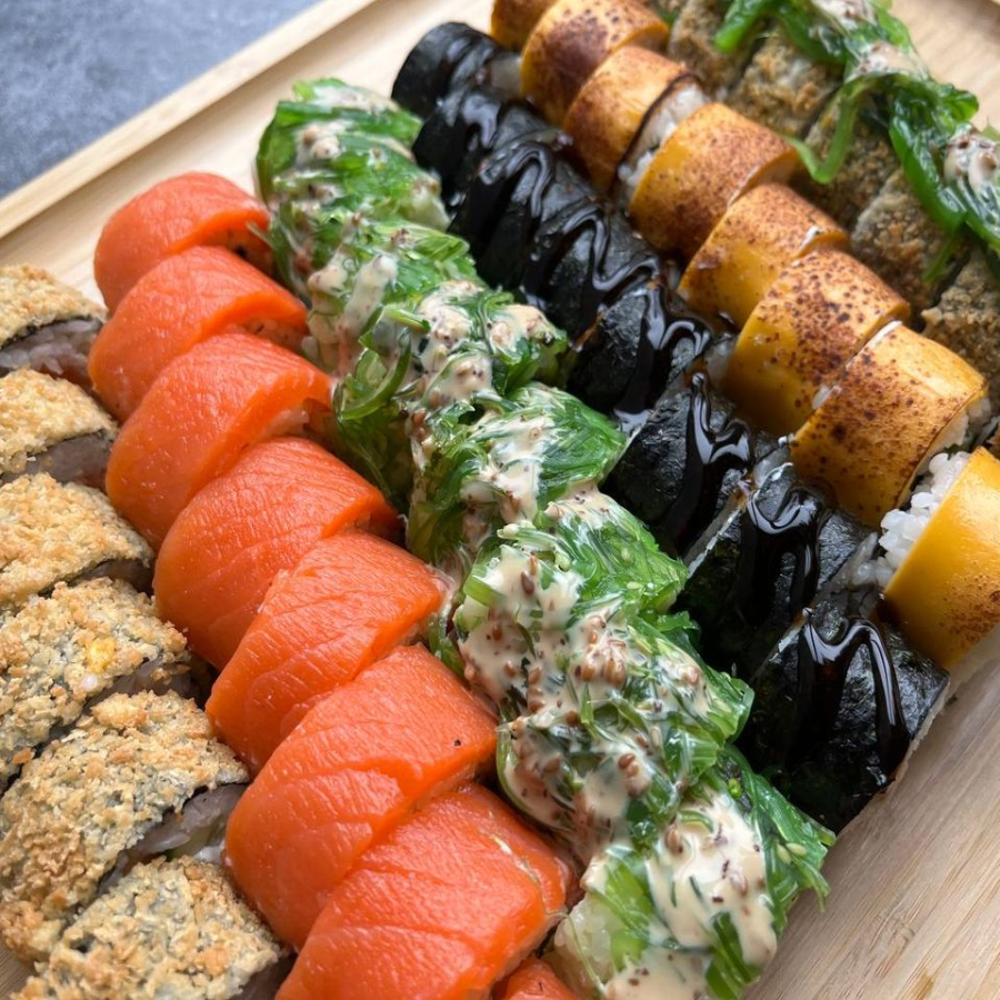 Заказать Запеченный ролл с лососем, запеченный ролл с мидиями, запеченный ролл Тунцом, запеченный ролл с креветкой.