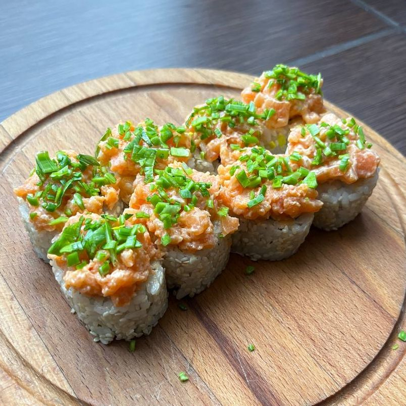 Рис, нори, сыр, авокадо, перец болгарский, лосось, соус спайси, порей. Нежный тар-тар из лосося в сочетании со спайси соусом, хрустящим болгарским перцем и нежнейшим авокадо.