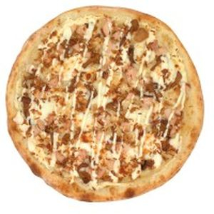 Соус белый, сыр моцарелла, куриная грудка подкопчённая, опята маринованные, лук криспи, соус альфредо.