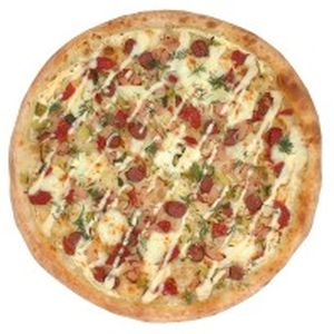 Соус белый, сыр моцарелла, пепперони, ветчина, колбаски чешские, корнишоны, лук, соус альфредо.