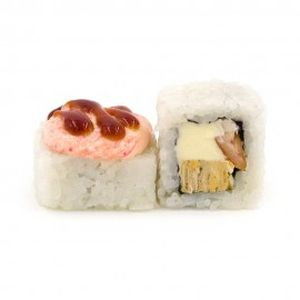 Куриная грудка подкопчённая, омлет японский, сыр плавленый, спайси соус, сыр Пармезан, соус Унаги. (упаковка не включена в стоимость)