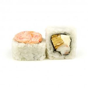 Креветки, омлет японский, сливочный сыр, спайси соус, сыр Пармезан. (упаковка не включена в стоимость)