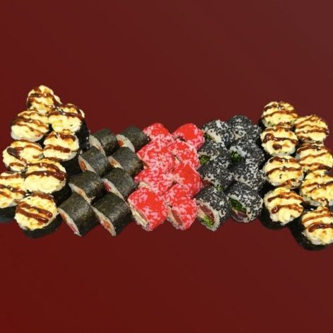 Ролл Лосось пикантный (рис, нори. сыр, лосось, имбирь), ролл Краб грейпфрут (рис, нори, сыр, грейпфрут, краб, икра масаго), ролл Тунец чука (рис, нори, тунец, чука, икра масаго, кунжут), запечённый ролл Мидия (рис, нори, сыр, мидия, дайкон, сырная шапка), запечённый ролл Свежесть (рис, нори, огурец, помидоры. перец, сырная шапка). Японский гарнир и палочки не входят в стоимость.