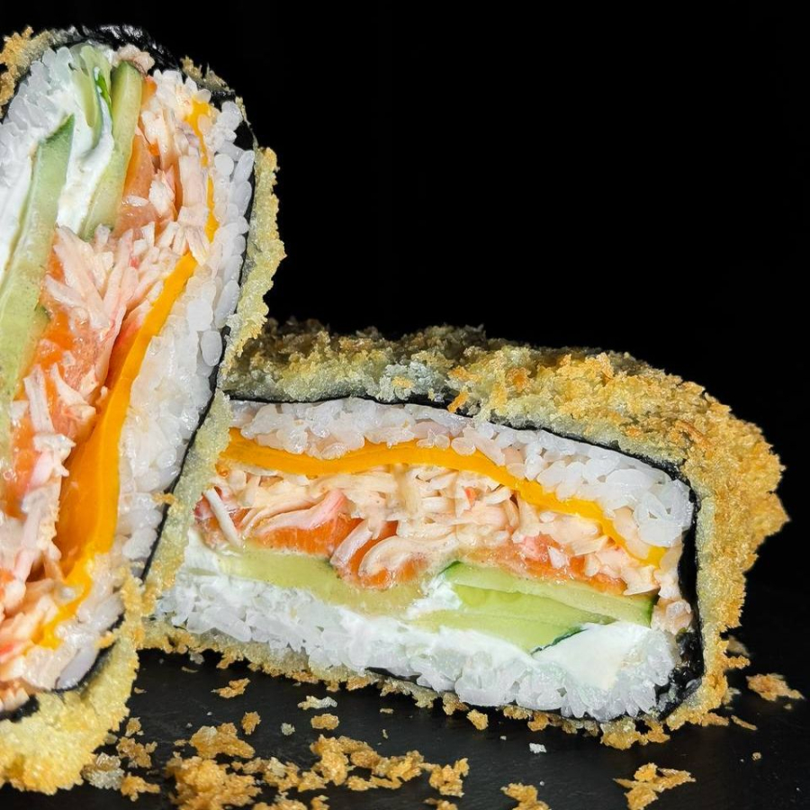 Заказать Рис, нори, сыр, лосось, снежный краб, огурец, сыр чеддер, терияки.