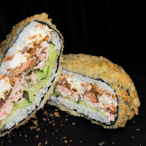 Заказать Рис, сыр творожный, терияки лосось, снежный краб, огурец, лук криспи, темпура, терияки.