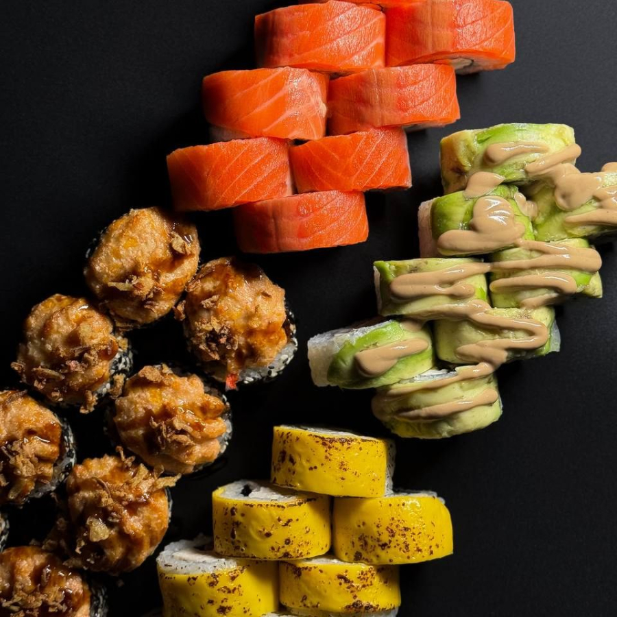 Фила с авокадо, запеченный ролл с тунцом, запеченный ролл с курицей, ролл с креветкой в сыре Чеддер.