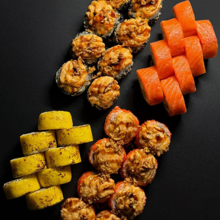 Фила с огурцом, запеченный ролл с лососем, запеченный ролл с курицей и беконом, ролл Бонито с копченым лососем, ролл Пира в чуке, ролл с тунцом и креветкой.