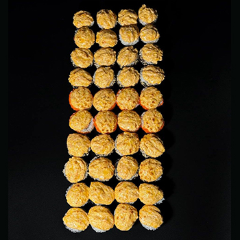 Запеченный ролл с креветкой и манго (нори, рис, сыр, креветка, манго, сырная шапка, терияки), запеченный ролл с угрем (нори, рис, сыр, угорь, огурец, сырная шапка, терияки), запеченный с мидиями и снежным крабом (нори, рис, сыр, мидии, снежный краб, огурец, спайси, сырная шапка), запеченный ролл с лососем и тунцом (нори, рис, сыр, лосось, тунец, огурец, масаго, сырная шапка, терияки), запеченный ролл с курицей и беконом (нори, рис, сыр, курица, бекон, томат, кунжут, сырная шапка, терияки, лук криспи).