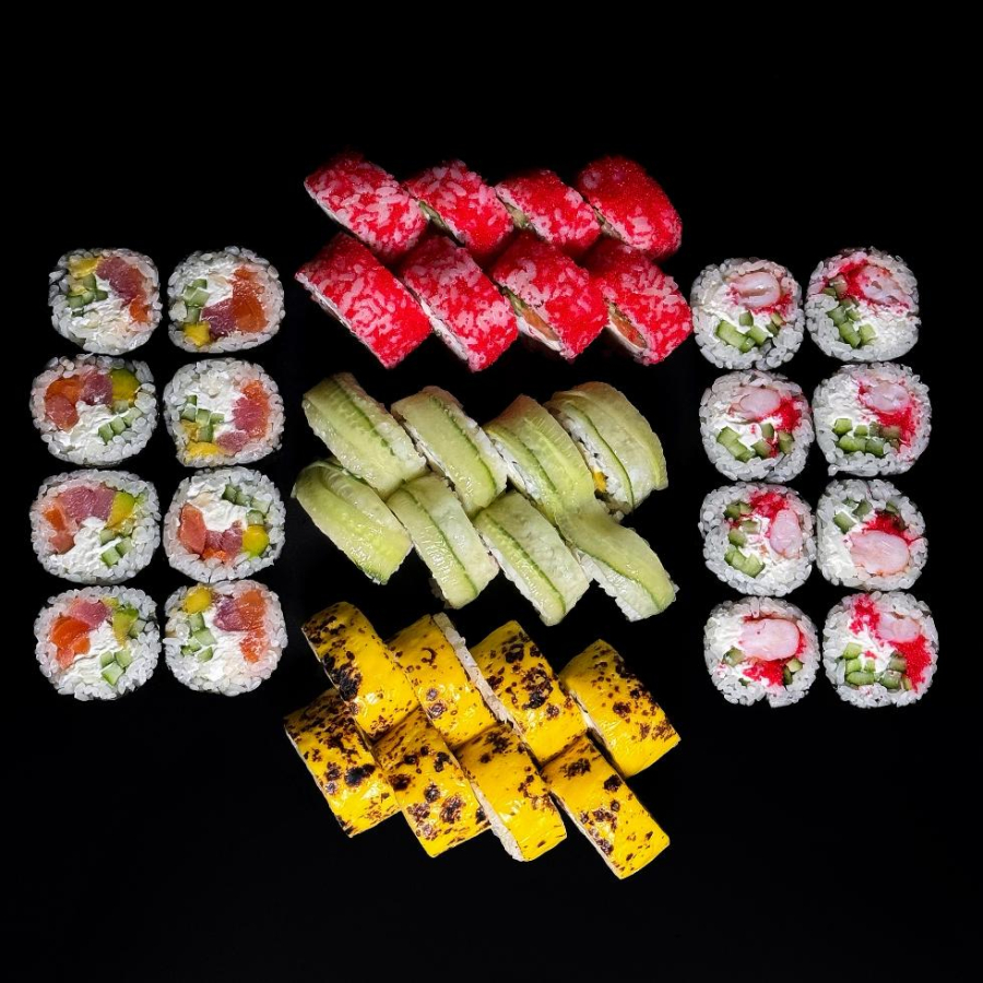 Запеченный ролл с курицей терияки 8шт, опаленный бекон спайси 8шт, ролл такуан с креветкой темпура 8шт, ролл с курицей в сыре Чеддер 8шт.