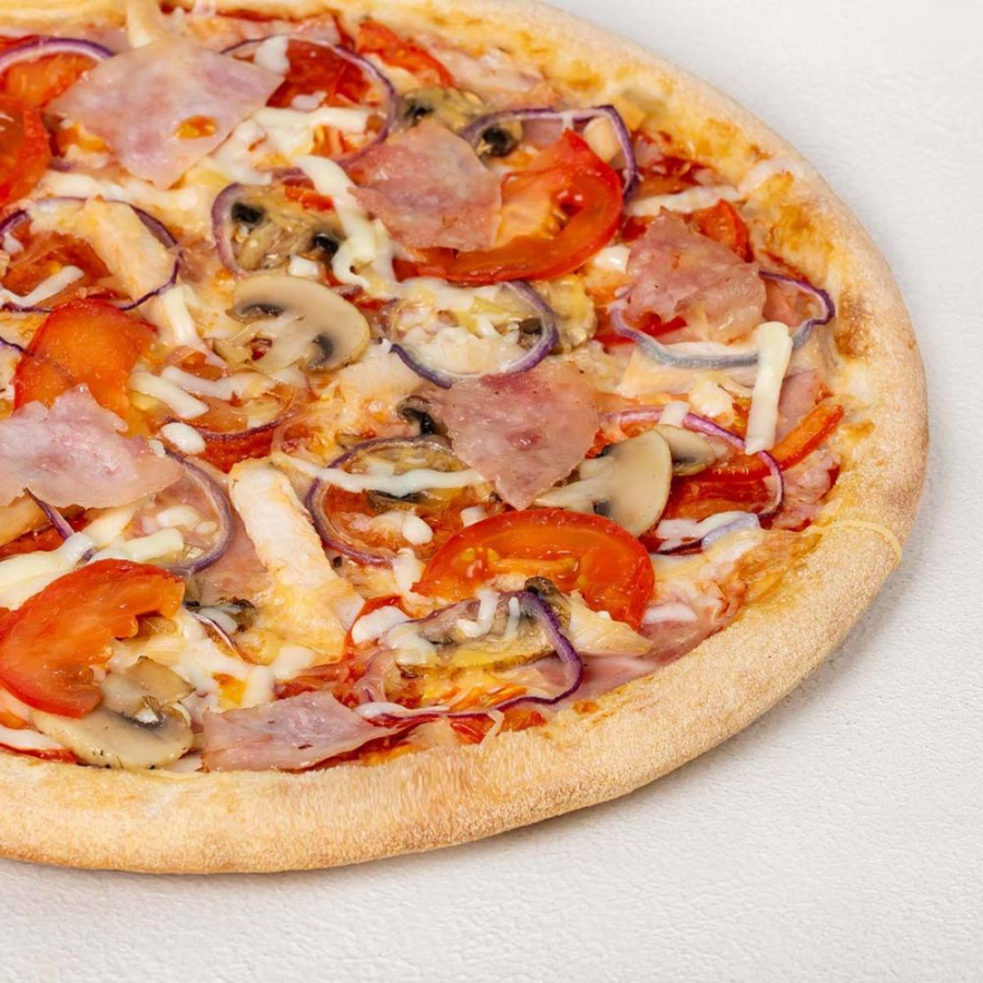 Цыпленок, пепперони, ветчина, моцарелла, пармезан, шампиньоны, томаты, красный лук, пицца-соус.