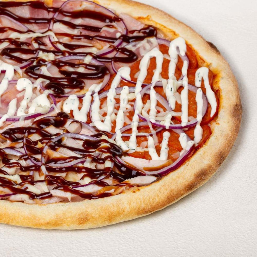 Пепперони, ветчина, цыпленок копченый, бекон, моцарелла, пармезан, красный лук, пицца-соус, сливочно-чесночный соус, барбекю соус.