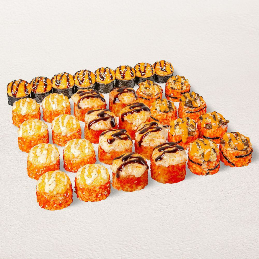 Заказать Ролл Филадельфия в масаго, ролл Калифорния с тигровой креветкой, запеч. ролл Аяши XL, ролл Пиканто с цыплёнком, ролл Крабик.