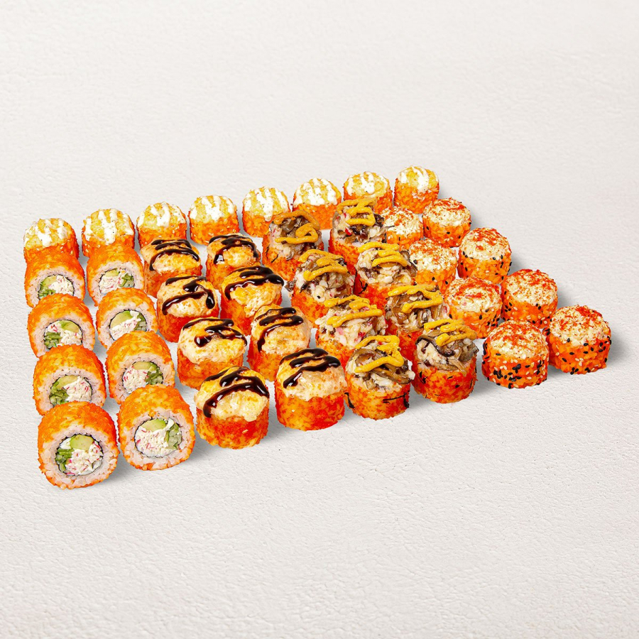 Ролл Филадельфия Гурман, ролл Королевская креветка, ролл Филадельфия в масаго, запеч. ролл Лосось Унаги XL, запеч. ролл Тигровая креветка с моцареллой, запеч. ролл Окунь чиз.