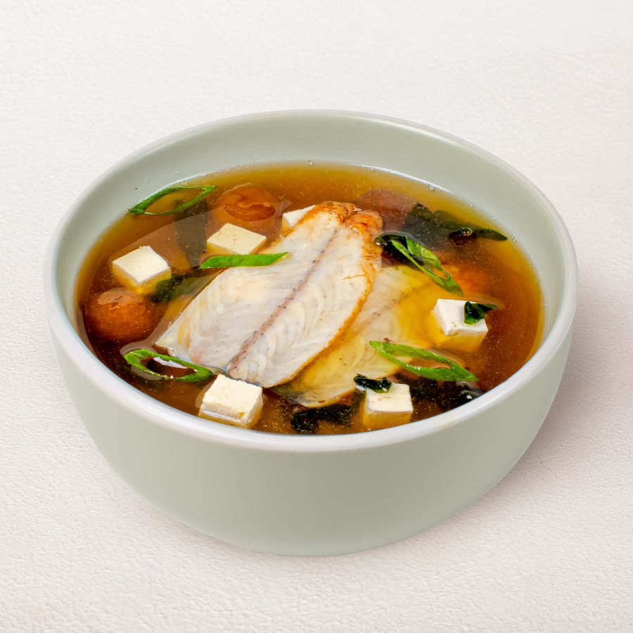 Заказать Мисо бульон, грибы намеко, сыр тофу, водоросли вакамэ, лук зеленый, угорь.