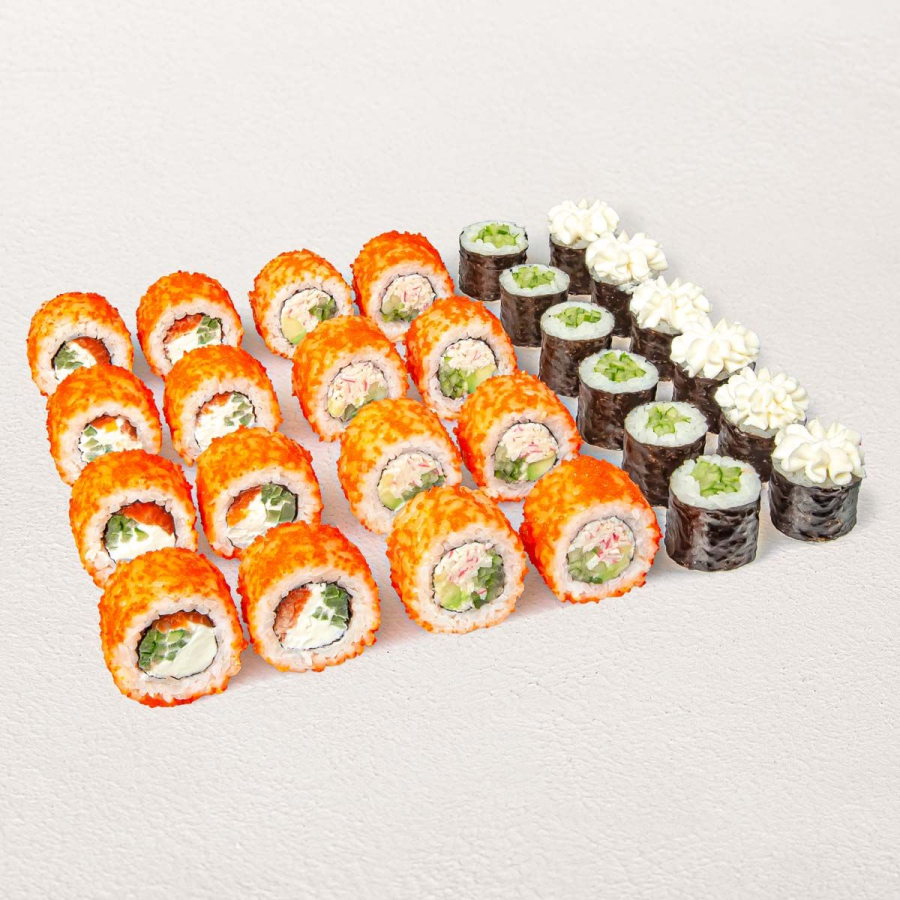Ролл Калифорния, ролл Филадельфия в масаго, ролл с огурцом, ролл Крабик.