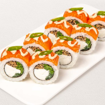 Лосось, сливочный сыр, салат айсберг, огурец, грибы шиитаке, зеленый лук, спайси соус, водоросли нори.