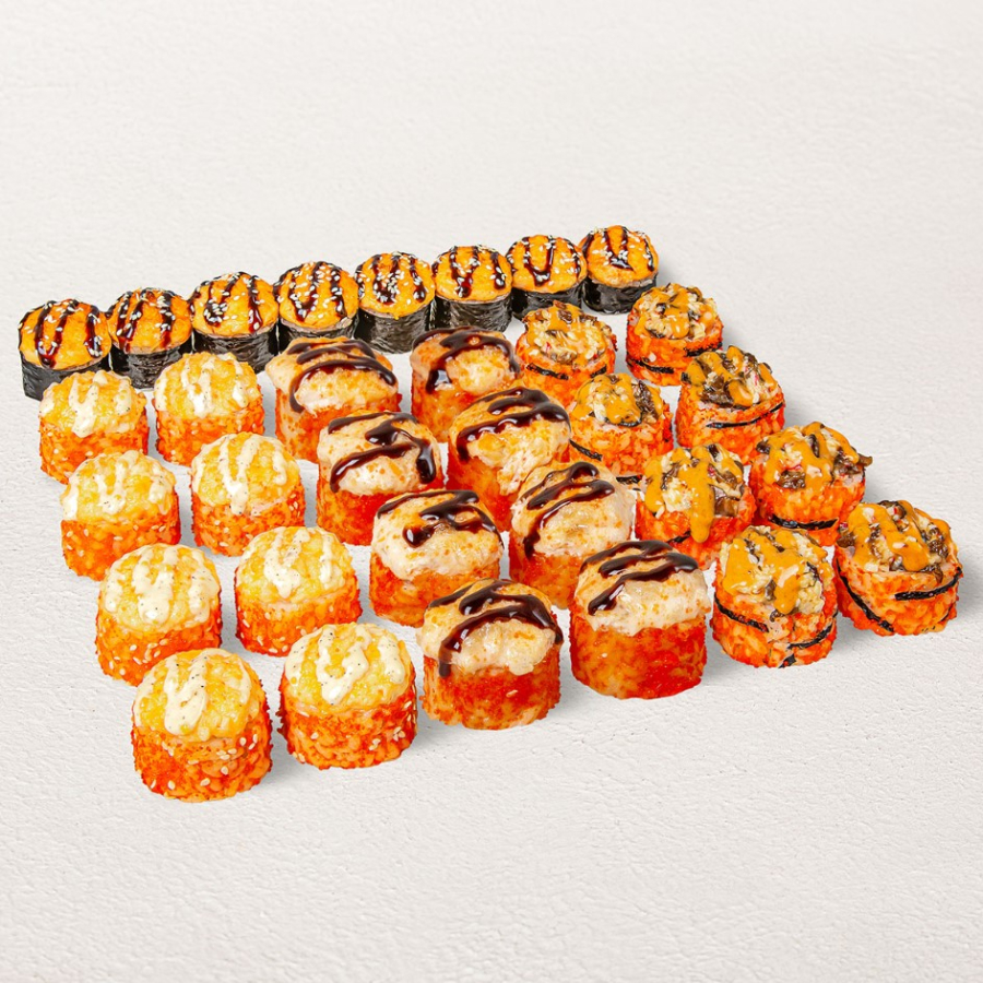 Запеч. ролл Аяши XL, ролл Пиканто с цыплёнком, ролл Калифорния с тигровой креветкой, ролл Филадельфия в масаго, ролл Крабик.