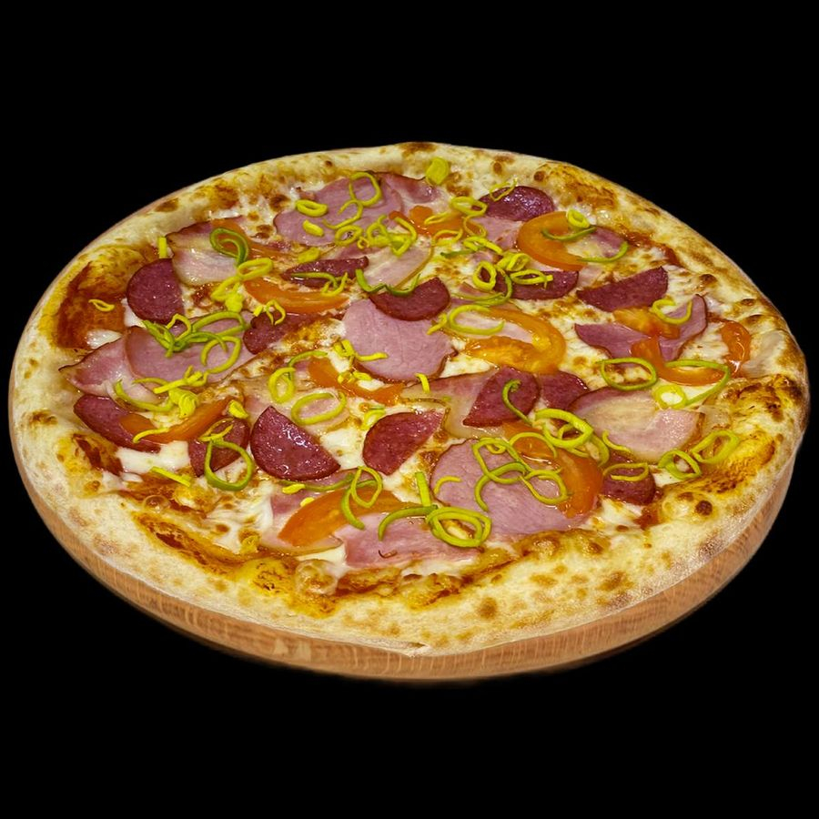Тесто, соус мутти, моцарелла, пепперони, куриное филе, ветчина, лук маринованный, переу болгарский, шампиньоны, маслины, орегано.