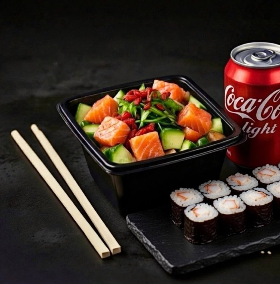 Заказать Поке с лососем, Хосомаки с крветкой (8шт), Кока кола без сахара 0.33л.