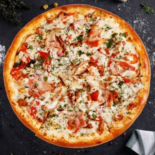 Заказать Тесто, сливочно-чесночный соус, сыр моцарелла, бекон, ветчина, томаты, лук, прованские травы.