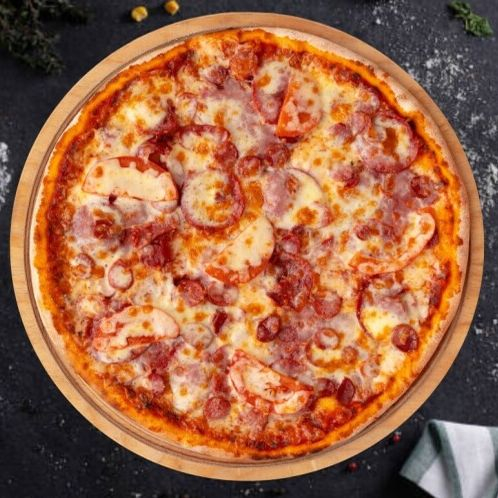 Заказать Тесто, соус пилати, сыр моцарелла, ветчина, пепперони, колбаски охотничьи, томаты, прованские травы.