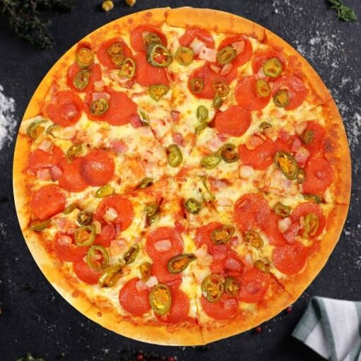 Заказать Тесто, соус пилати, сыр моцарелла, пепперони, халапенью, прованские травы.