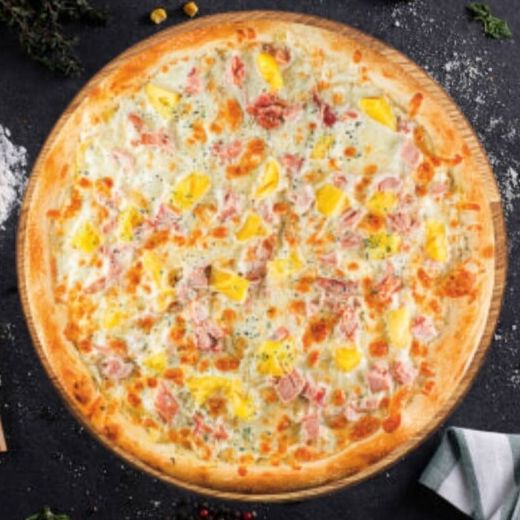 Заказать Тесто, сливочно-чесночный соус, сыр моцарелла, курица, ананас, прованские травы.