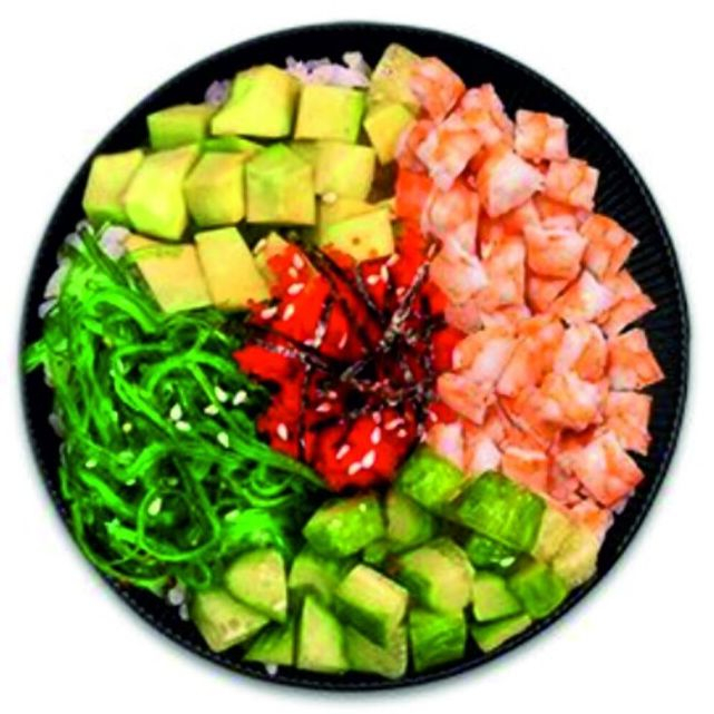 Рис, курица копченая, авокадо, огурец, икра масаго, чука, ягоды годжи, соус.