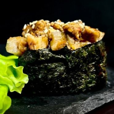 Рис, нори, мидии, сырная шапочка, соус терияки.