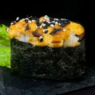 Рис, нори, снежный краб, сырная шапочка, соус терияки.