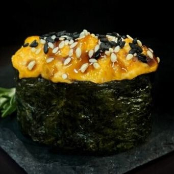 Рис, нори, угорь, сырная шапочка, соус терияки.