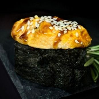 Заказать Рис, нори, курочка копчёная, сырная шапочка, соус терияки.