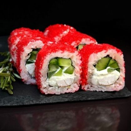 Заказать Рис, нори, сыр творожный, огурец, креветка, икра масаго.