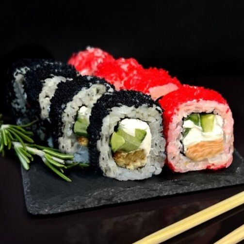 Рис, нори, сыр творожный, огурец, кунжутный соус, лосось, авокадо, икра масаго.