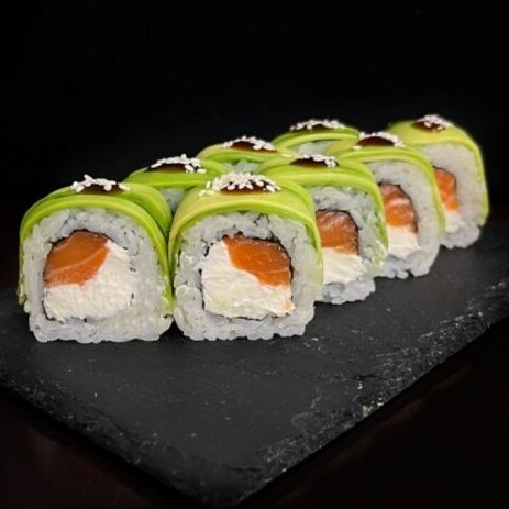 Рис, нори, сыр творожный, авокадо, лосось, соус терияки, кунжут.