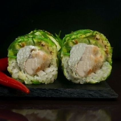 Рис, нори, сыр творожный, курица копчёная, чука, кунжутный соус.