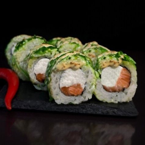 Заказать Рис, нори, сыр творожный, лосось, чука, кунжутный соус.